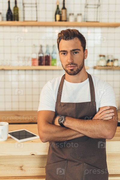 Портрет молодого бариста в фартуке в кафе