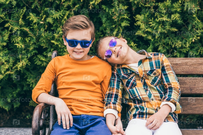 Стильные маленькие дети в темных очках, сидя на скамейке в парке
