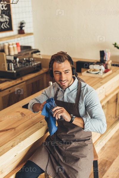Прослушивание музыки в наушниках во время протирания посуды в кафе