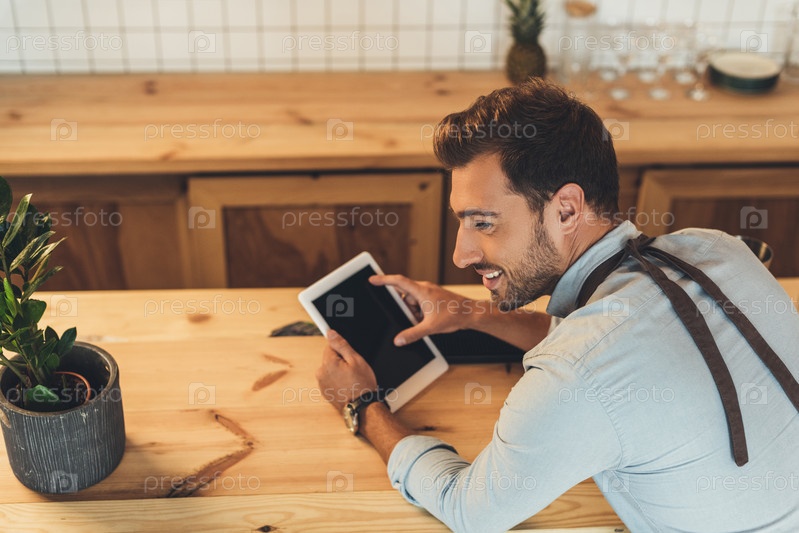 Бариста с планшета в кафе