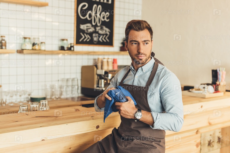 Задумчивый бариста в фартука протирает посуду