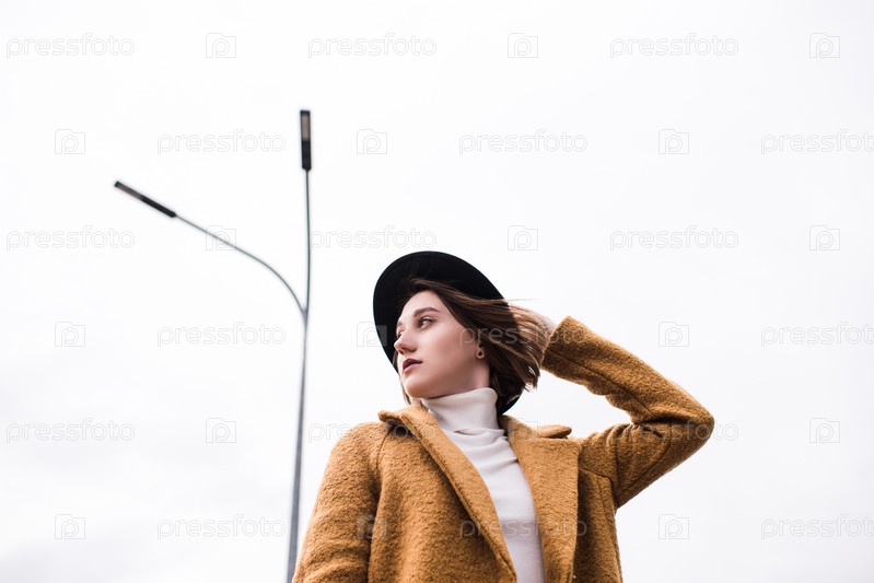 Женщина держит черную шляпу в ветреную погоду