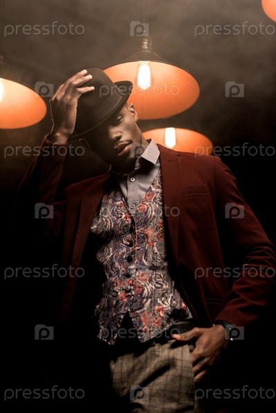 Красивый стильный афро-американский мужчина в темной комнате с лампами