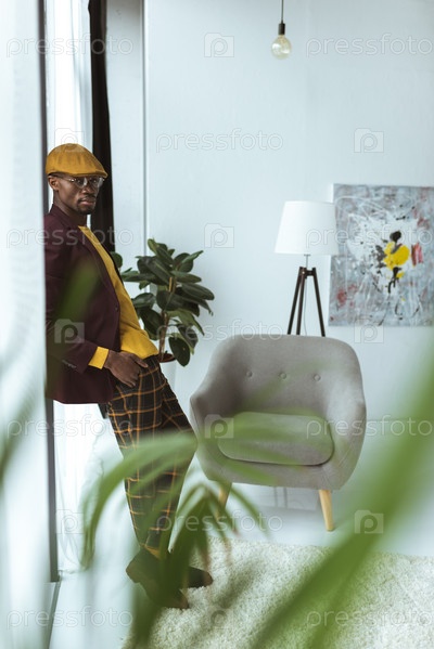 Красивый стильный афро-американский мужчина в клетчатых штанах, шапке и куртке