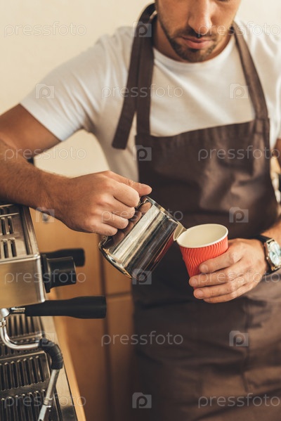 Бариста наливает молоко в бумажный стаканчик