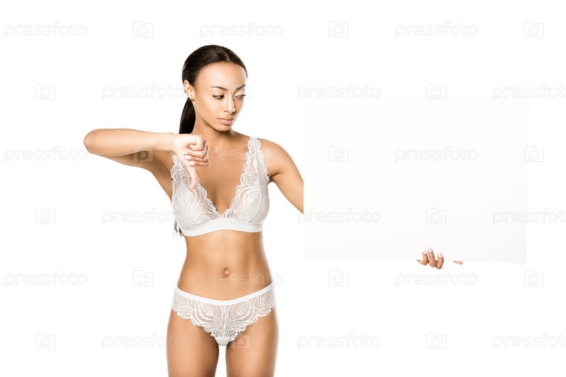 Афро-американская женщина, глядя на пустой баннер и показывая большой палец вниз
