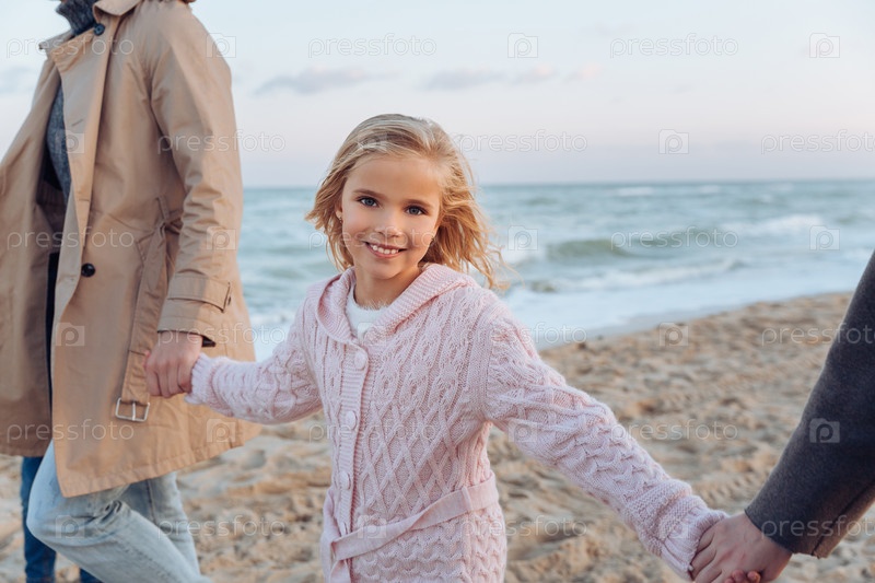 Держась за руки с родителями во время прогулки по берегу моря осенью