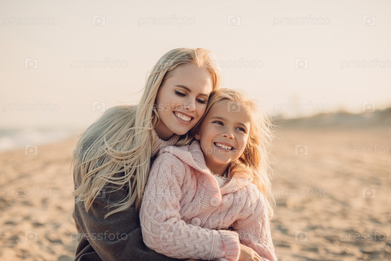 Счастливая мать обнимает ее дочь, проводя время на песчаном пляже