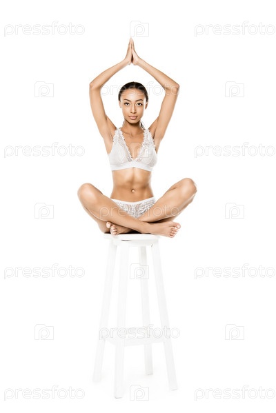 Афро-американской женщина в нижнем белье, сидя в позе лотоса
