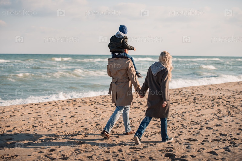 Родители с сыном на плечах, идущих на берегу моря осенью