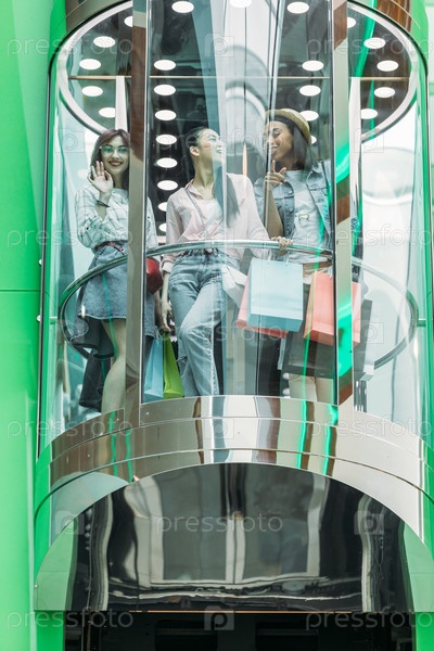 Счастливые стильные друзья с сумками в лифте в торговом центре