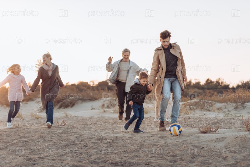 Семья с мячом на песчаном пляже