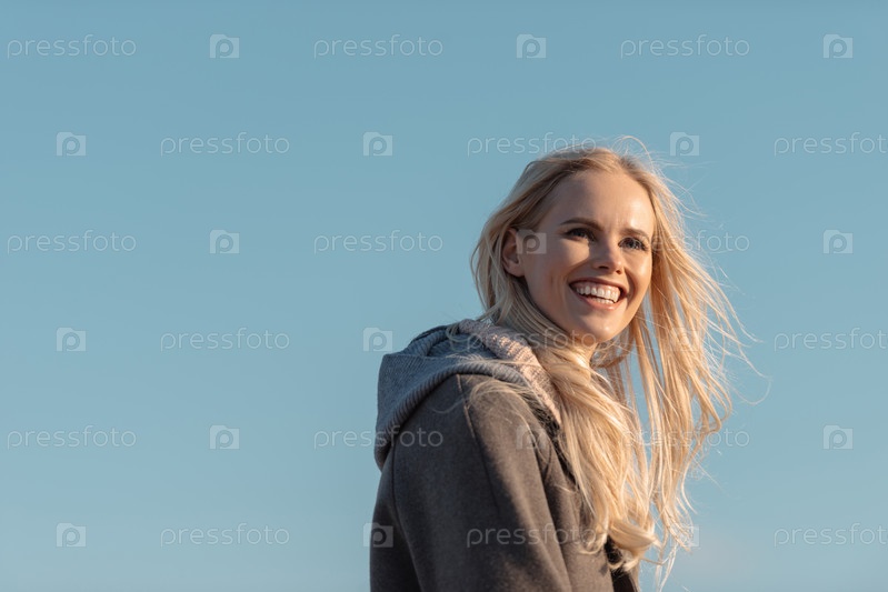 Портрет красивой улыбающейся женщины с голубым небом на фоне