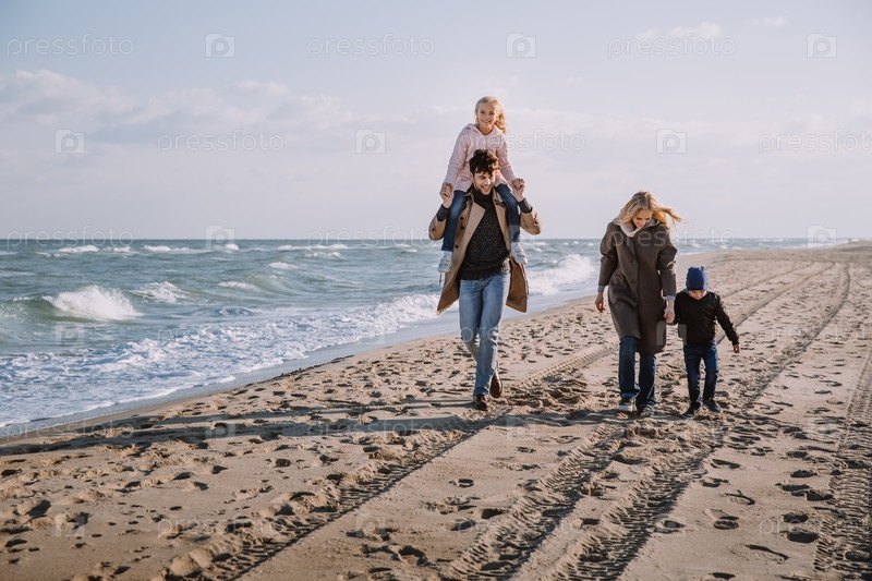 Счастливая семья на побережье осенью