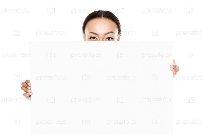 Девушка прячется за пустой баннер
