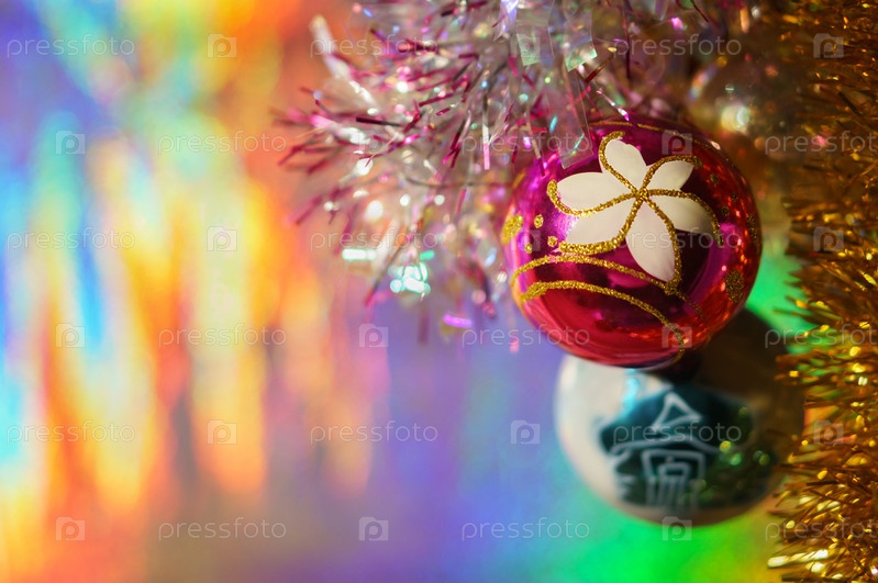 Новогодние шары с мишурой на цветном фоне