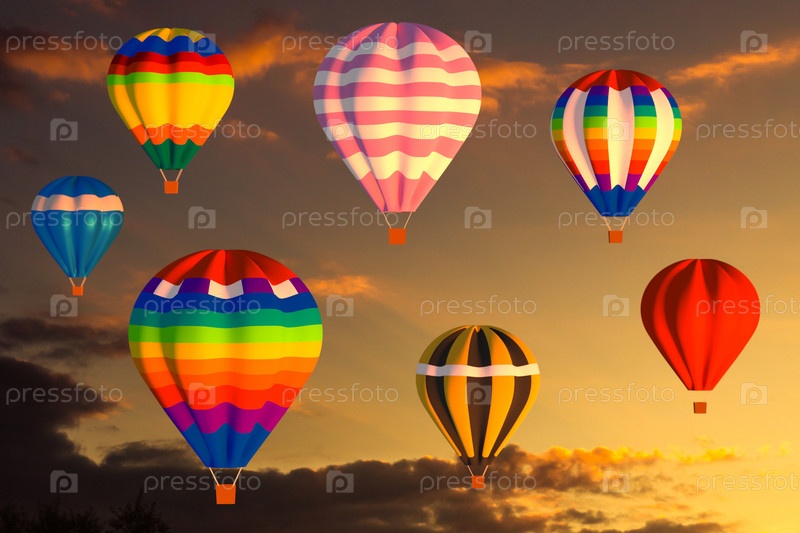 Красочные воздушные шары летят в закатном небе