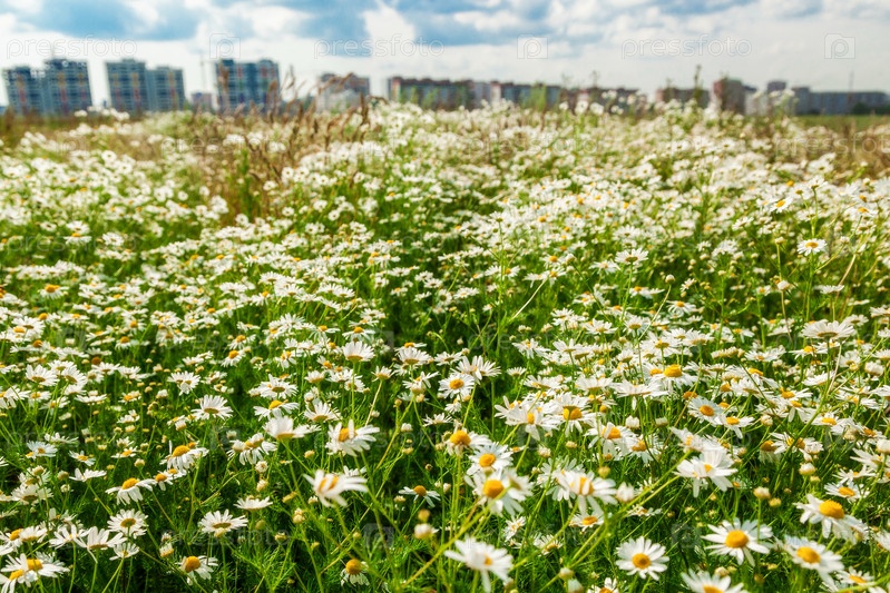 Поле цветов и многоэтажные здания