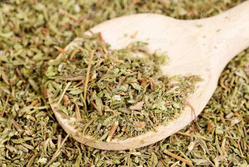 Сушеный чабрец и деревянная ложка, фон