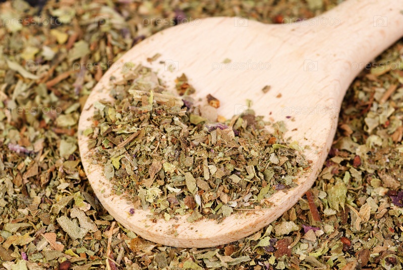 Сушеный базилик и деревянная ложка, фон