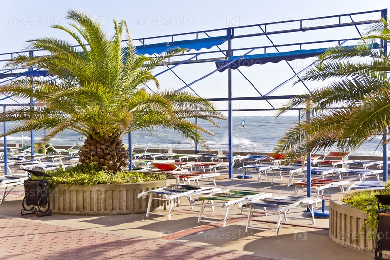 Пустой пляж с шезлонгами