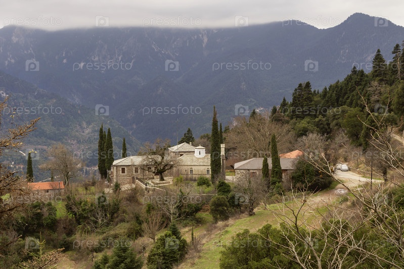 Православный каменный монастырь в горах, западная Греция