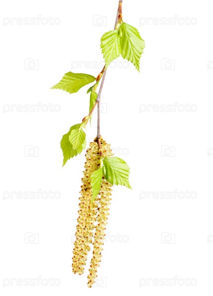 Весенняя березовая веточка с зелеными листьями и сережками на белом фоне