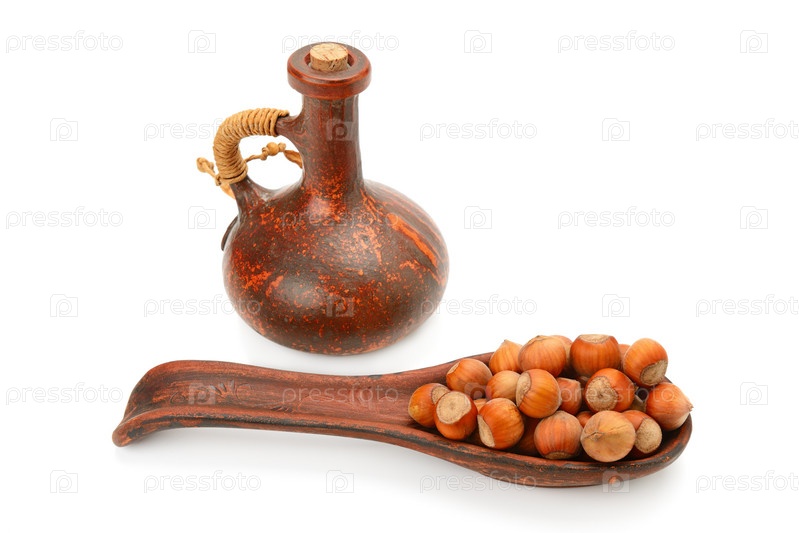 Орехи и ореховое масло в глиняной бутылке