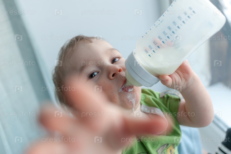Ребенок пьет молоко из бутылки