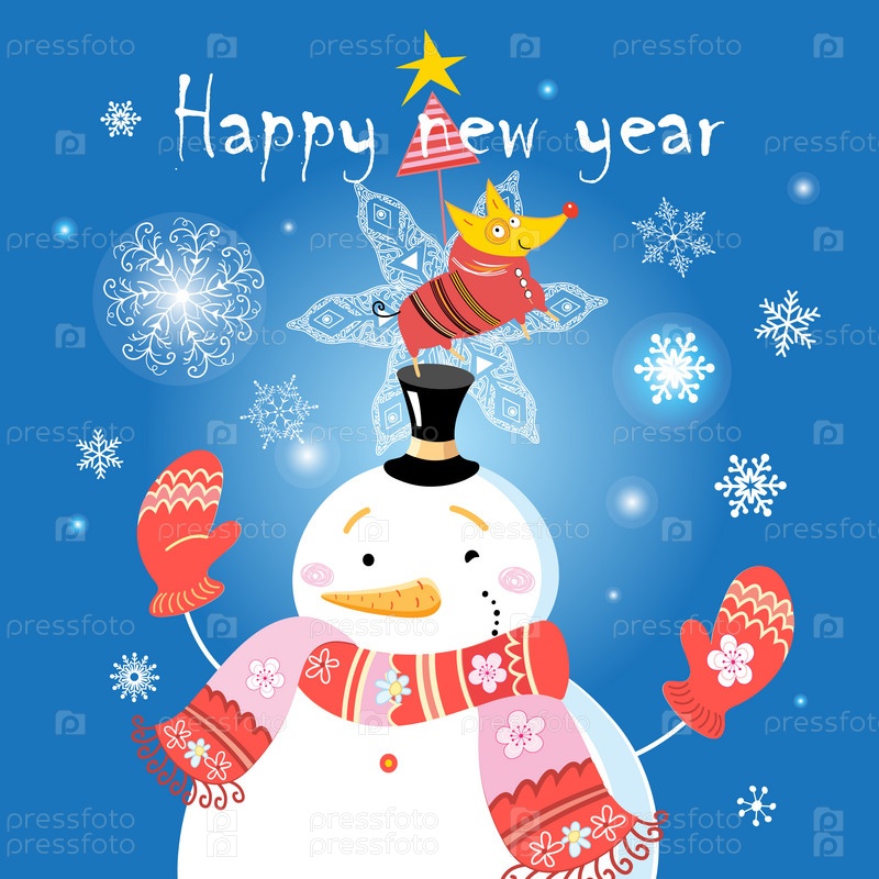 Рождественская открытка со снеговиком и собакой