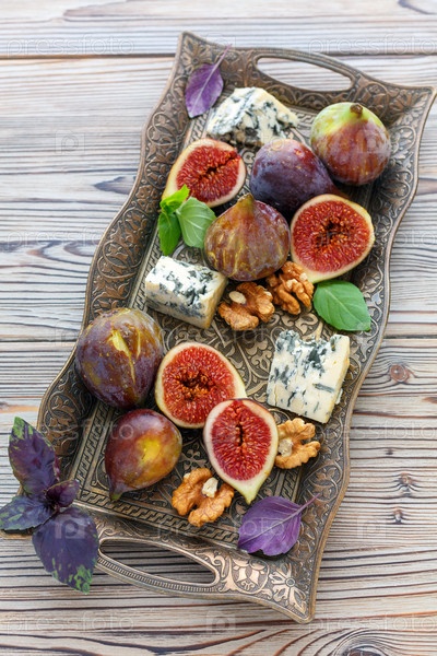 Голубой сыр и спелый инжир на бронзовом подносе