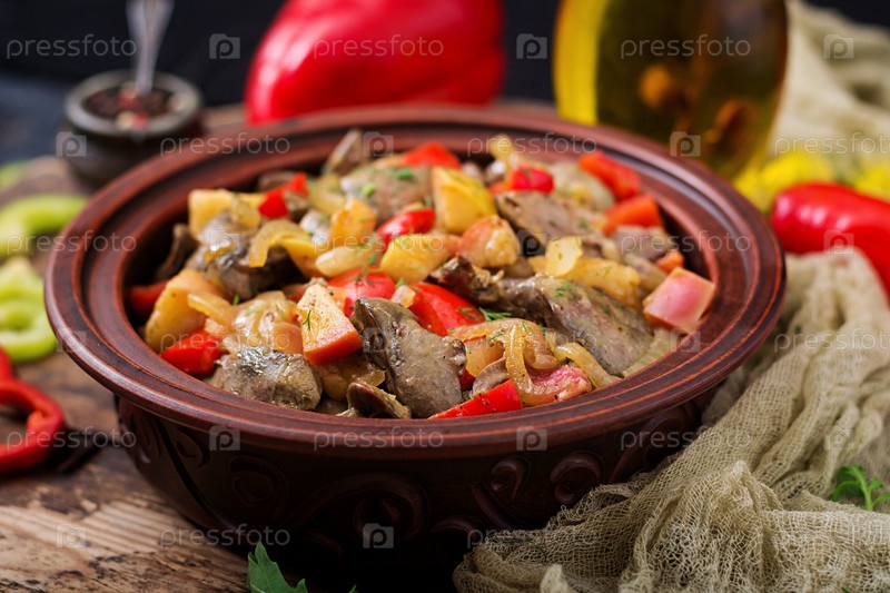 Жареная куриная печень с овощами на деревянном фоне