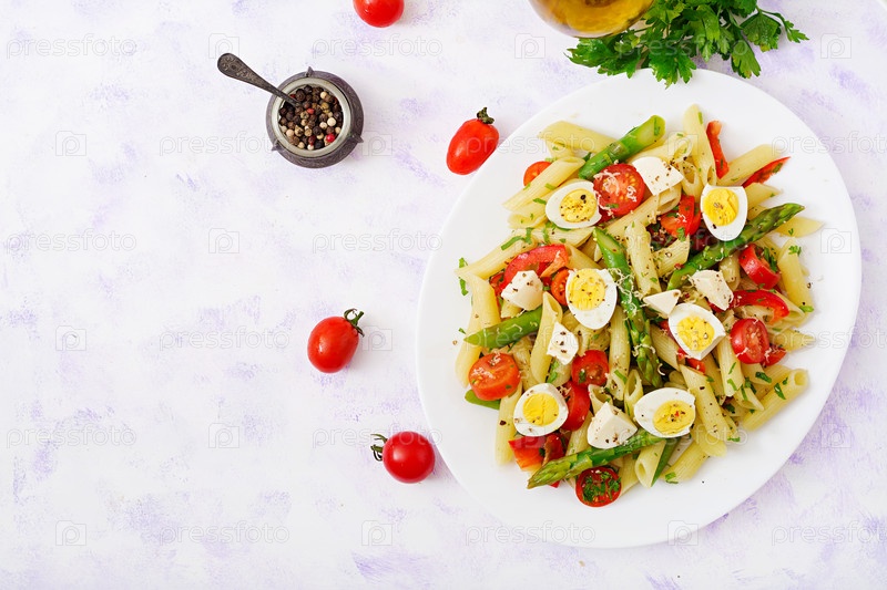 Салат-паста со спаржей, помидорами, перепелиными яйцами, сыром моцарелла