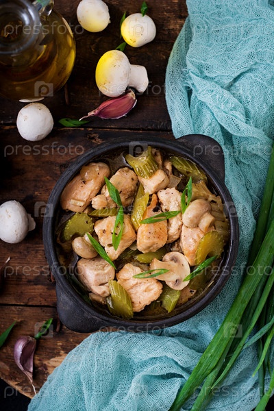 Нежные кусочки куриного филе с грибами и сельдереем, тушенные в светлом пиве
