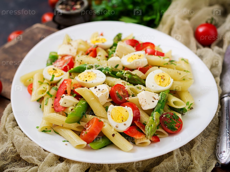 Салат-паста со спаржей, помидорами, перепелиными яйцами, сыром моцарелла