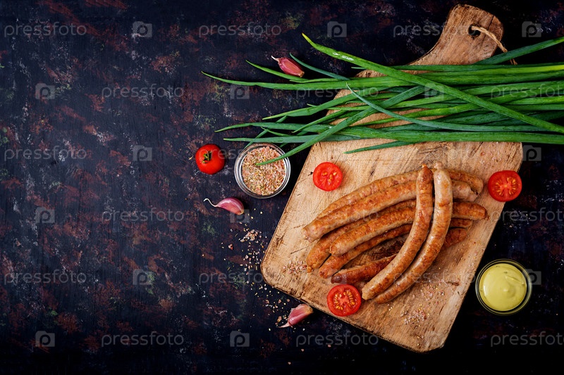 Жареные колбаски на темном фоне