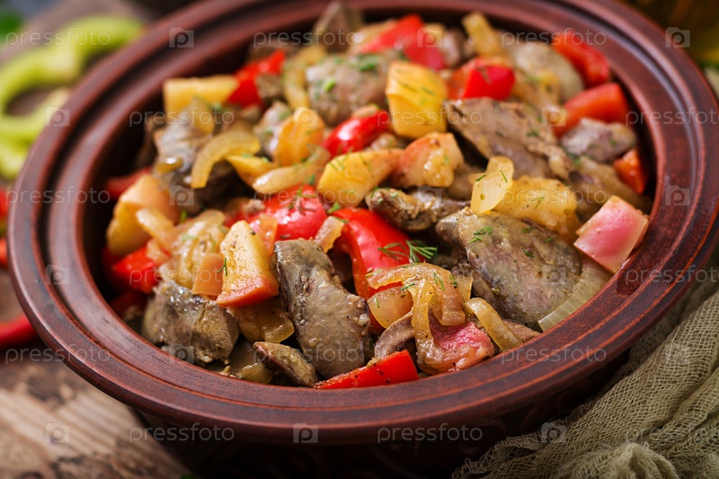 Жареная куриная печень с овощами на деревянном фоне