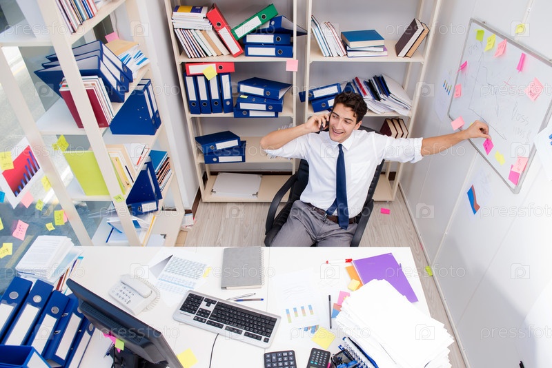 Бизнесмен, работающий в офисе с грудой книг и бумаг