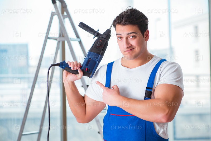 Молодой работник с ручной дрелью