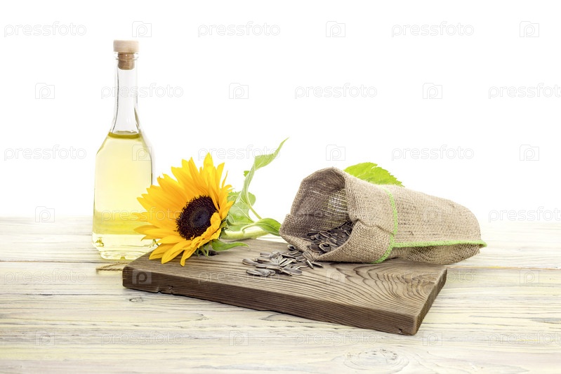 Сырые семена подсолнечника и подсолнечное масло на белом фоне