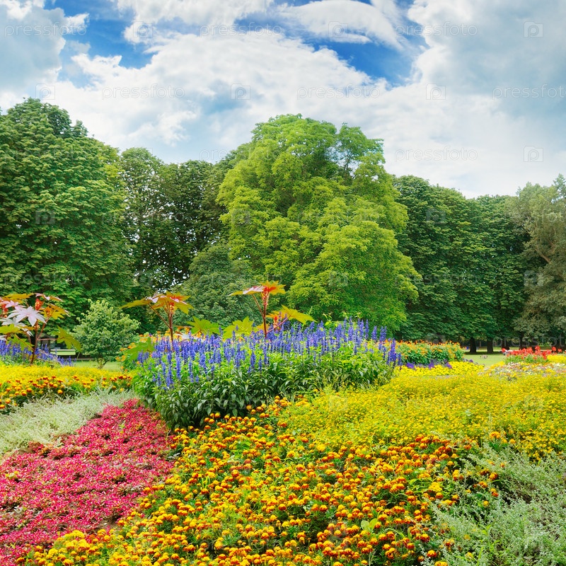 Летний парк с красивой клумбой