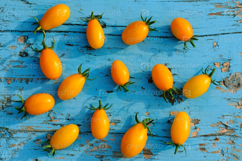 Желтые помидоры на синей деревянной поверхности