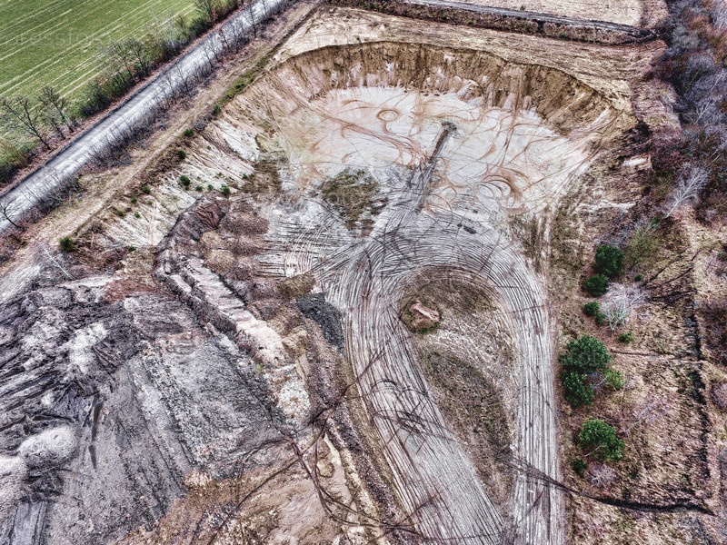 Аэрофотосъемка песчаной ямы между полями и лугами