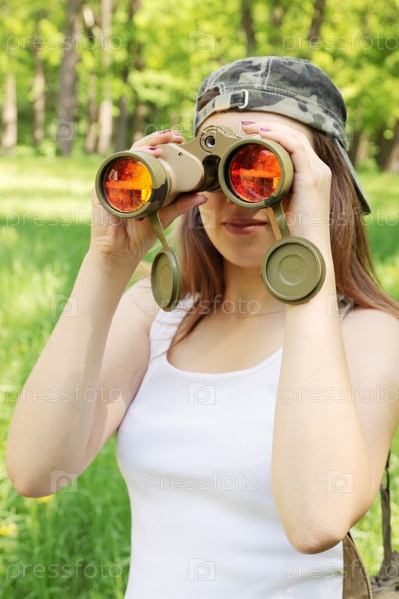 Красивая женщина в кепке смотрит в бинокль