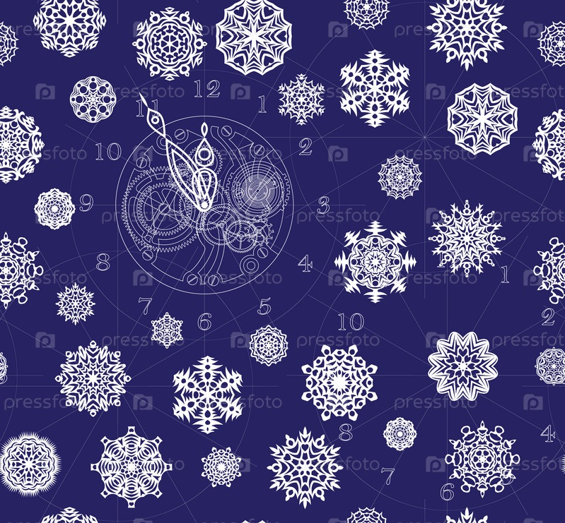 Шаблон бесшовный часы с механизмом и снежинками