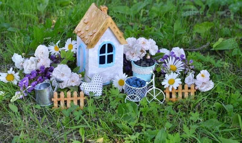 Красивый крошечный белый дом с полевыми цветами