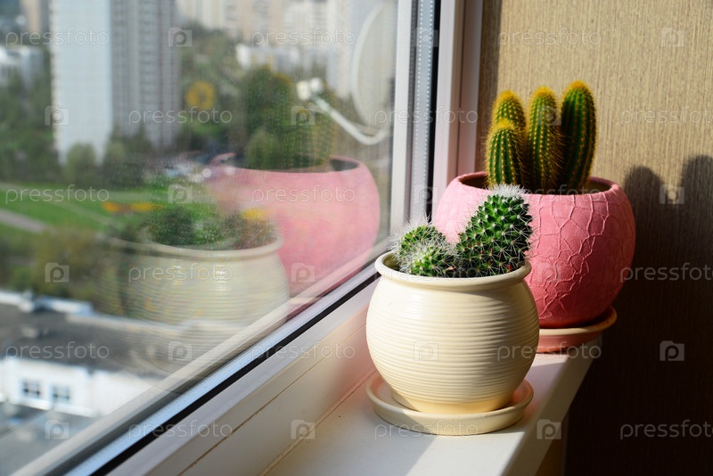 Кактусы стоят на подоконнике