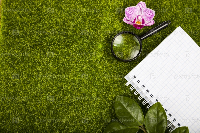 Блокнот, лупа и зеленые листья