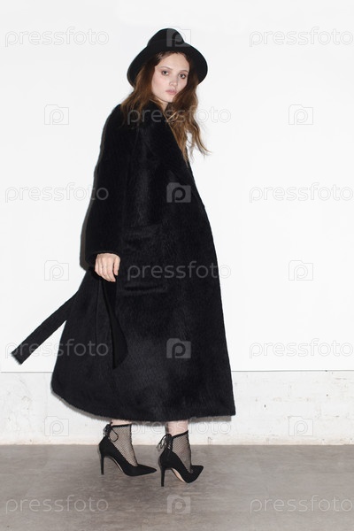 Стильная модель в длинном черном пальто
