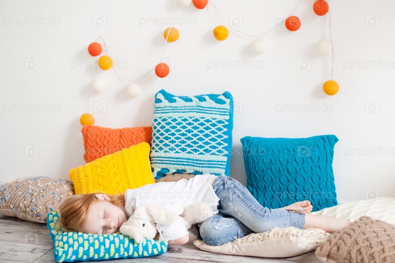 Рыжая девочка спит на красочных подушках